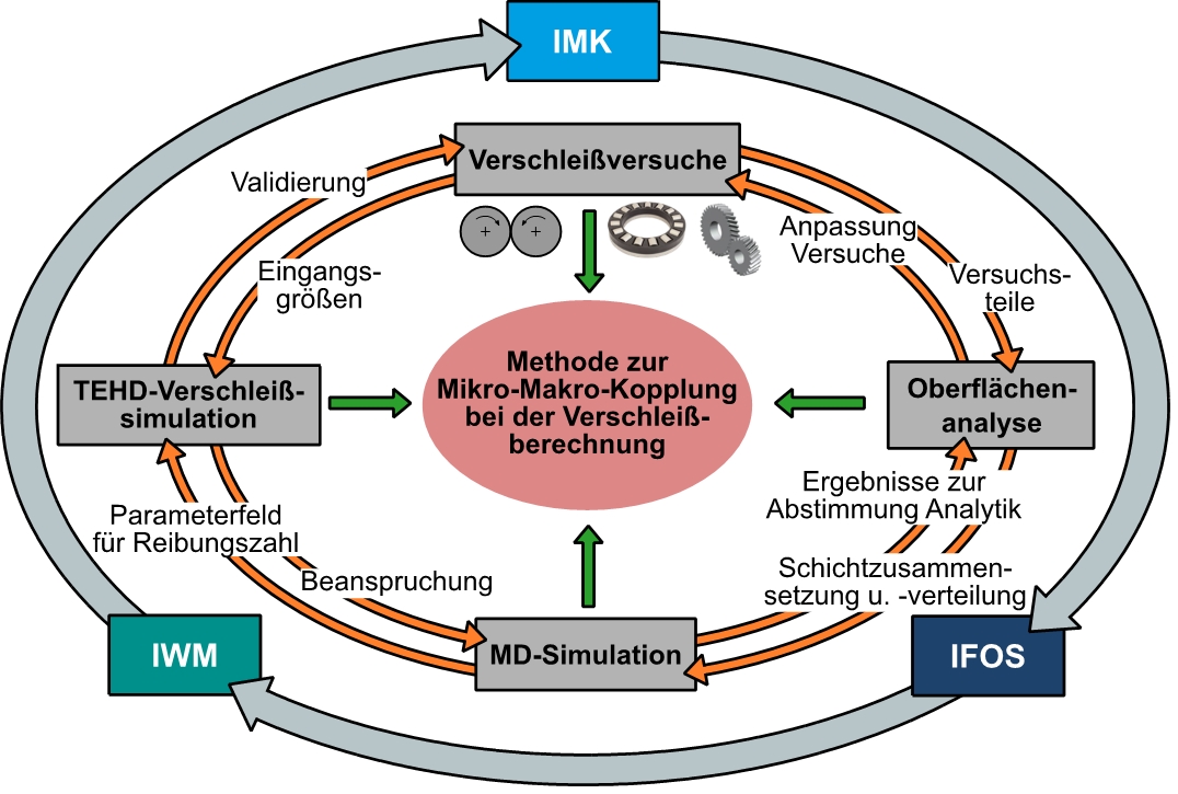 Entwicklung einer Berechnungsmethode für adhäsiven Verschleiß, bei der eine Kopplung zwischen verschiedenen Größenskalen (von der atomaren Ebene bis zum Tribokontakt) und Disziplinen (Tribologie, Physik, Chemie) stattfindet.