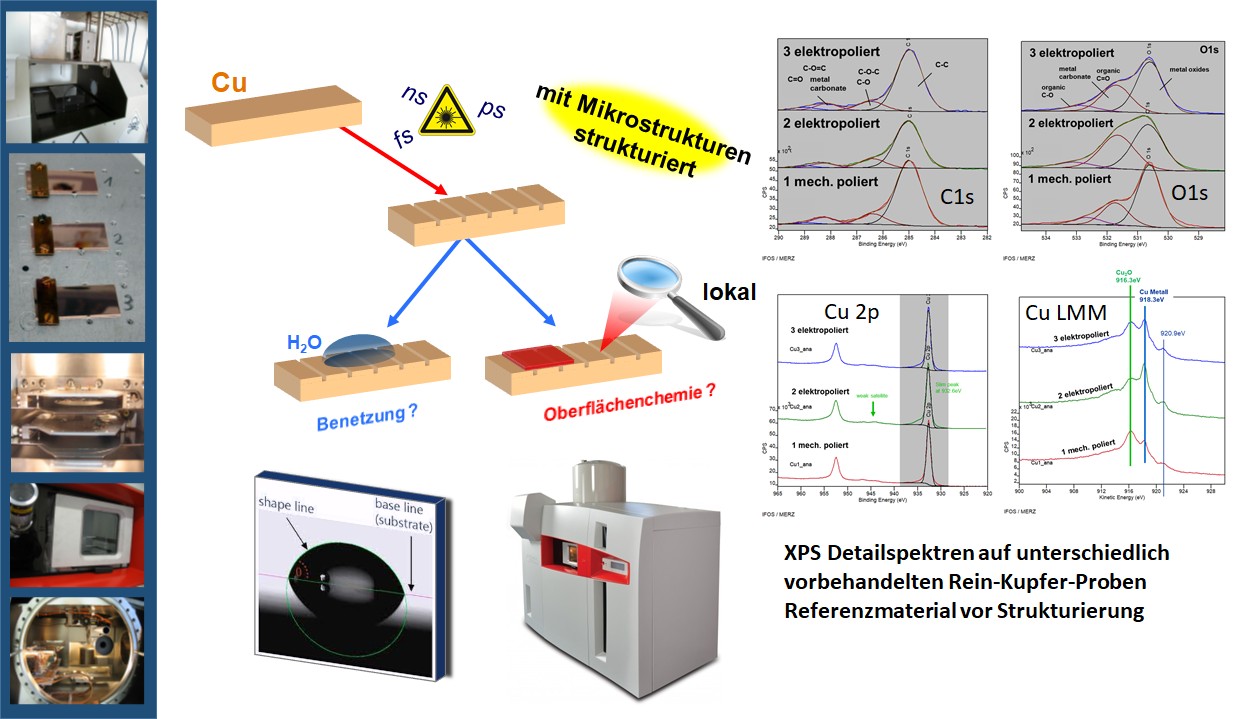 - Forschungsziel ist der Aufbau eines grundlegenden und systematischen Verständnisses zum Einfluss der Oberflächenchemie und Oberflächentopographie laserstrukturierter Kupferoberflächen auf deren Benetzungsverhalten.