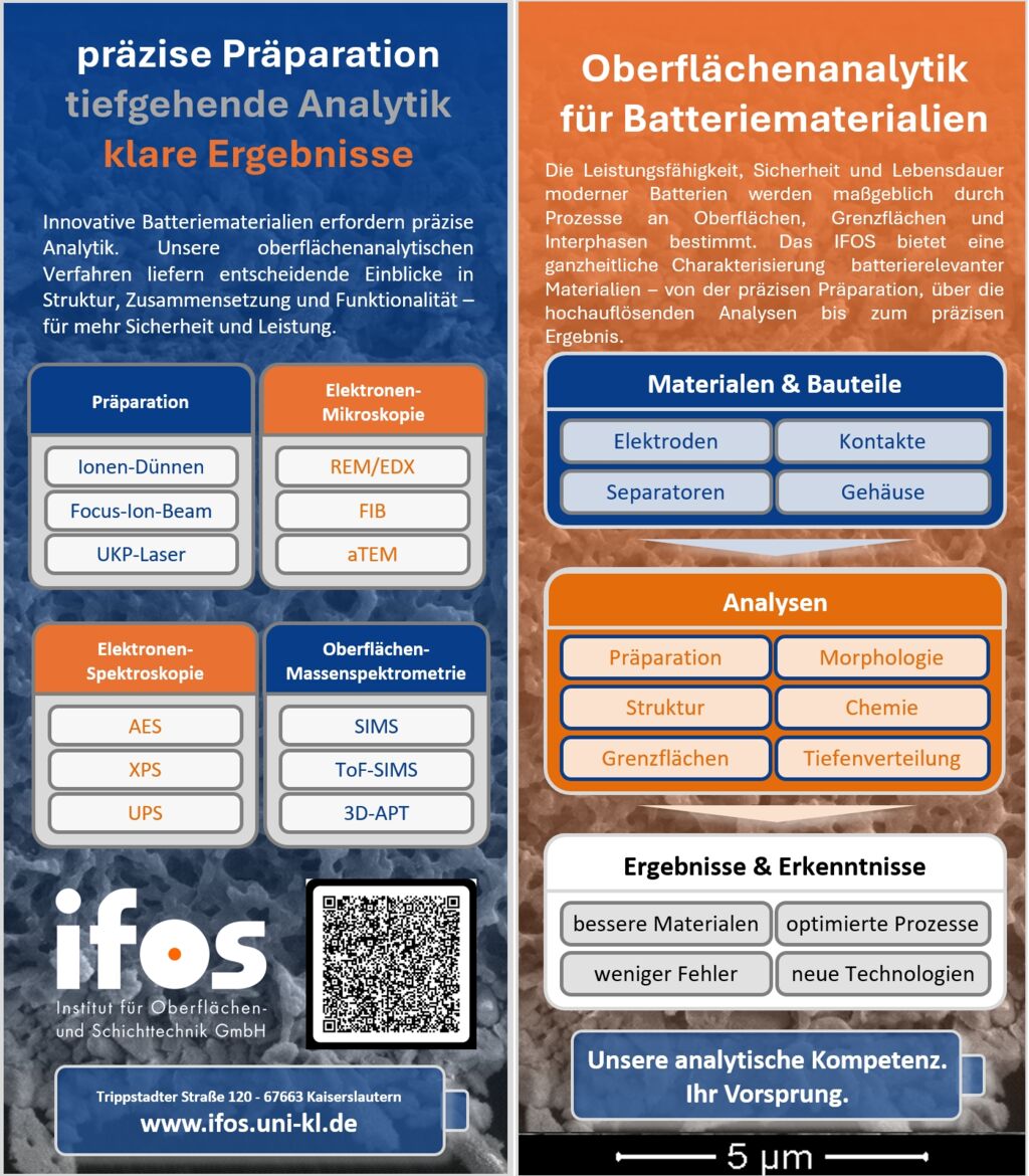 Der Zukunftsbereich Battery@IFOS bündelt unsere langjährige Expertise in Oberflächen- und Grenzflächenanalytik, Tribologie, Dünnschichttechnologie und UKP-Laserpräparation für die nächste Phase der Batterieforschung.