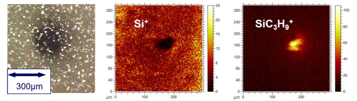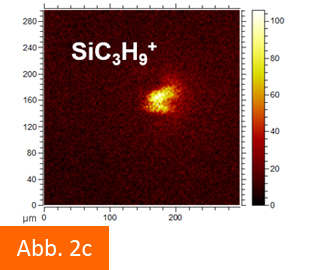 Man sieht, dass im Zentrum des Lackkraters tatsächlich kaum noch Si+ emittiert wird. Stattdessen findet man in diesem Bereich zum Beispiel ein starkes Sekundärionensignal, das man dem Molekülion SiC3H9+ (Abb. 2c) zuordnen kann. Die genauere Analyse zeigt, dass man im Zentrum der Lackkrater generell solche für Polydimethylsiloxane PDMS typischen Sekundärionen (z. B. Si(CH3)n …) findet. ToF-SIMS ist in diesem Zusammenhang eine sehr gute Nachweismethode, weil das Verfahren zum einen überaus empfindlich bereits kleinste Spuren von PDMS nachweisen kann.
