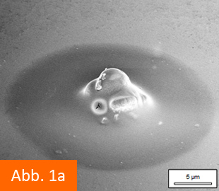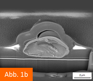 Eine elektronenmikroskopische Analyse (Abb. 1a) zeigt, dass an diesen Stellen kleine „Hügel“ aus der ansonsten glatten Oberfläche herausgewachsen sind. Diese nur wenige µm großen Erhebungen kann man nun mit Hilfe eines fokussierten Ionenstrahls (FIB: Focused Ion Beam) anschneiden, um herauszufinden, was sich in ihrem Inneren verbirgt.