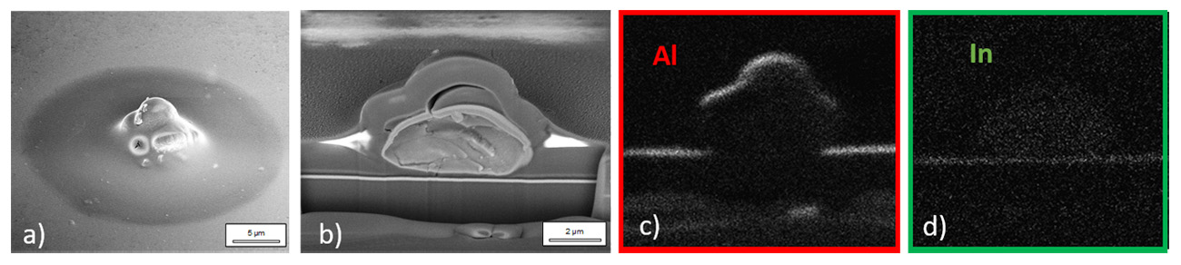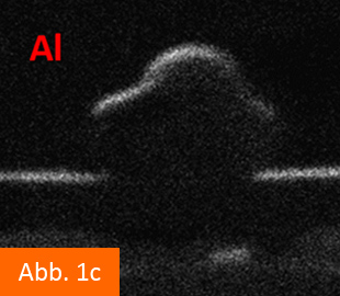 Abb. 1c und 1d zeigt die entsprechenden Verteilungen für Aluminium (Al) und Indium (In). Man erkennt, dass die In-Schicht (als Monitor für die ITO- Schicht der OLED) auch im Defektbereich noch völlig intakt ist, während die Al-Schicht (Rekombinationsschicht) an der Stelle, wo der Defekt auftritt unterbrochen ist und in diesem Bereich oberhalb der gebildeten Blase verläuft. Offenbar ist das „Malheur“ also beim Aufbringen der Rekombinationsschicht passiert und hier müssen die weitere Fehlersuche und schließlich auch die zugehörigen Abhilfemaßnahmen ansetzen.