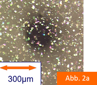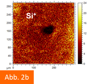 Abb. 2 zeigt ein Beispiel, bei dem der Lack auf einem Stahlblech lokal nicht haftet, weil eine Kontamination das offenbar verhindert. In der lichtmikroskopischen Aufnahme (Abb. 2a) ist vergrößert einer der Lackkrater dargestellt, die bereits mit bloßem Auge sichtbar sind. Der verwendete Lack enthält Siliziumverbindungen und deshalb kann die Lackbedeckung auf der Stahloberfläche mit Hilfe der Flugzeit - Sekundärionen - Massenspektrometrie ToF-SIMS durch die laterale Emissionsverteilung der Siliziumionen Si+ wiedergegeben werden (Abb. 2b).